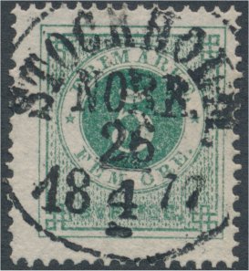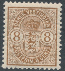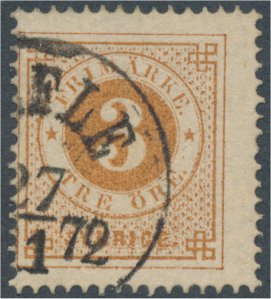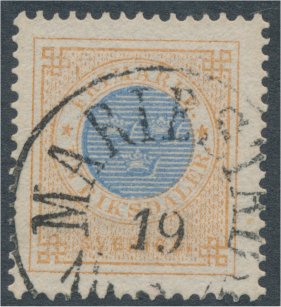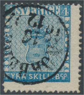 8 skilling från det 4:e eftertrycket 1885, undertyp a från pos 1 med hörnmarginal. Fastsättarspår i övre marginalen