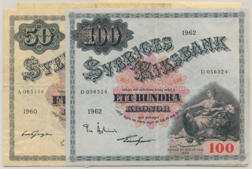 sedlar 100kr 1962 och 50kr 1960 samt ett antal 5kr och 10kr, totalt nominellt