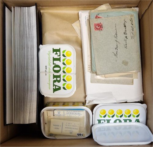bunt blad och två smöraskar med svenska automathäften. Bl.a. album finns
